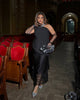 Топ с отворено рамо, който се съчетава перфектно с миди пола от сатен за елегантен и модерен комплект.