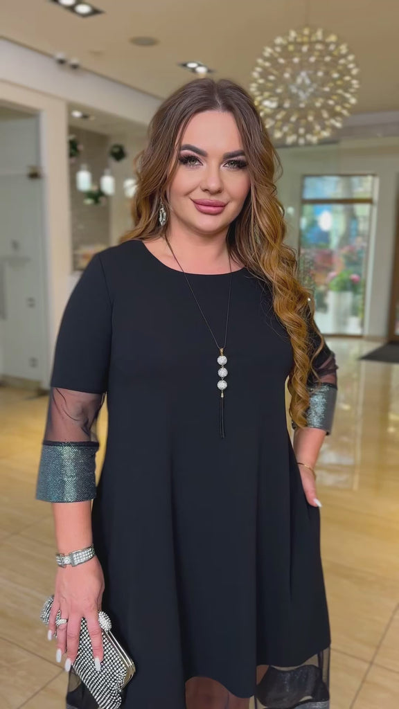 Елегантна рокля А-линейка с деликатен блясък – маст-хев за вашия гардероб! Изработена от премиален черен креп-дайвинг, приятен на допир, роклята визуално издължава силуета и придава елегантност и женственост. Чувствайте се уверена и стилна във всяка ситуация!
