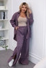 Трендов комплект оверсайз – риза с свободна кройка и палацо панталони с висока талия. Панталоните имат работещи копчета отстрани за допълнителен акцент.
