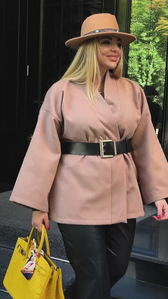 Свободно палто с елегантен прав силует и акцент на талията с широк колан. Без копчета, с връзване тип „прегърни ме“, то е идеално за пролетта и есента. Изработено от висококачествена плат, предлага се в бежово и черно.