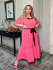 Миди рокля с свободен крой и леко струяща се материя, с ръкави, откриващи раменете. В долната част на роклята има нежен волан. Роклята изглежда елегантно и стилно, перфектна както за ежедневни излизания, така и за специални поводи.