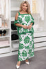 Комплект от блуза и пола. Лек летен костюм от ефирна материя с абстрактен принт, напомнящ на големи цветя или тропически мотиви. Свободна блуза с открити рамене, квадратно деколте и широки презрамки с кант по ръбовете на ръкавите и долната част. Полата е midi с прав силует и страничен разрез, съчетан с детайли от блузата. Ярък, лек и елегантен модел, подходящ за морска ваканция или разходки по курорта.
