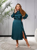 Елегантен комплект от блуза и пола, изработен от висококачествена синтетична коприна, предлагаща стил и изисканост. Блузата се закопчава с копчета по цялата дължина и има вратовръзка, добавяща фин акцент. Ръкавите завършват с ластик, осигурявайки удобство и модерен вид. Полата е свободна, с цепка и ластик в талията, като се закопчава с цип отзад. Тази комбинация от блуза и пола съчетава луксозната коприна с елегантен дизайн, идеален за специални поводи или официални събития.
