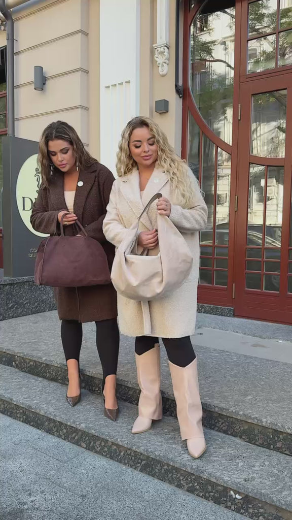 Стилно палто от еко каракул без подплата – топло, удобно и модерно. Средна дължина, закопчаване с копчета и практични джобове. Към модела е включена елегантна брошка.