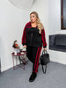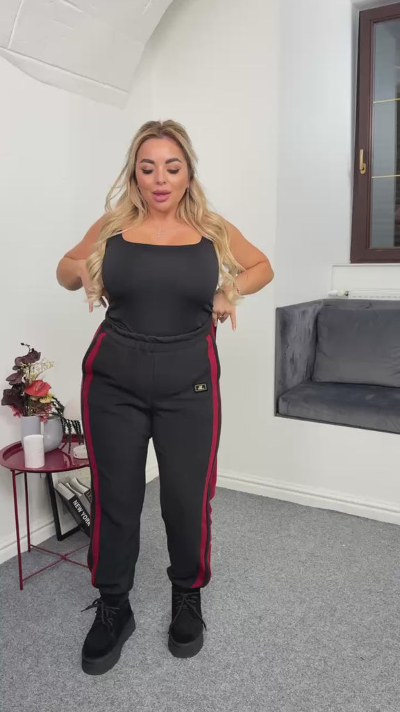 Комплект от флийс премиум качество — много топъл и приятен на допир. Стилни панталони с висока талия, еластична лента, маншети на крачолите, джобове и лампас. Горнището е с цип, качулка и стилна апликация, за модерен и удобен ежедневен вид.