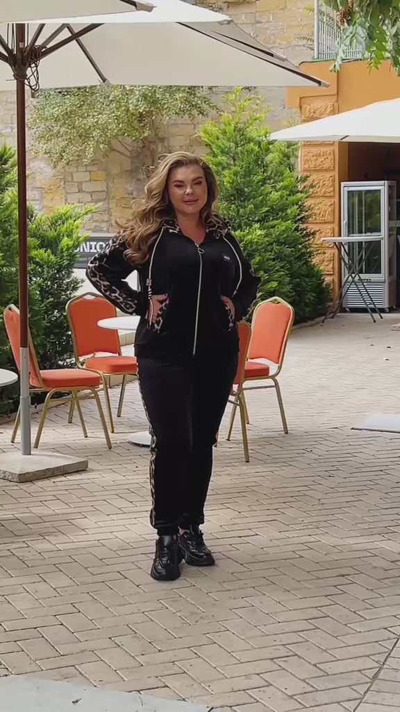 Комплект от качествена материя, приятен на допир и удобен за носене. Горнището е с широк силует, качулка, джобове и декорация с леопардови елементи, ръкави с маншети. Панталоните са с висока талия, обработени джобове и маншети на крачолите. Свободният крой осигурява максимален комфорт и свобода на движение.