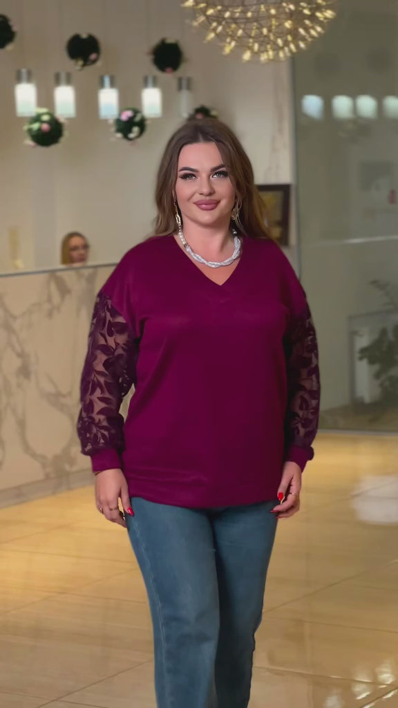 Ефектен джъмпер с широка кройка и V-образно деколте. Ръкавите са леко спуснати и завършват с маншет, а долният ръб е оформен с планка за завършен силует.
