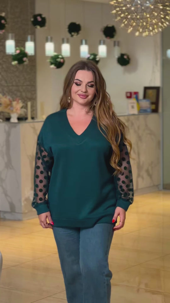 Ефектен джъмпер с широка кройка и V-образно деколте. Ръкавите са леко спуснати и завършват с маншет, а долният ръб е оформен с планка за завършен силует.