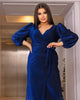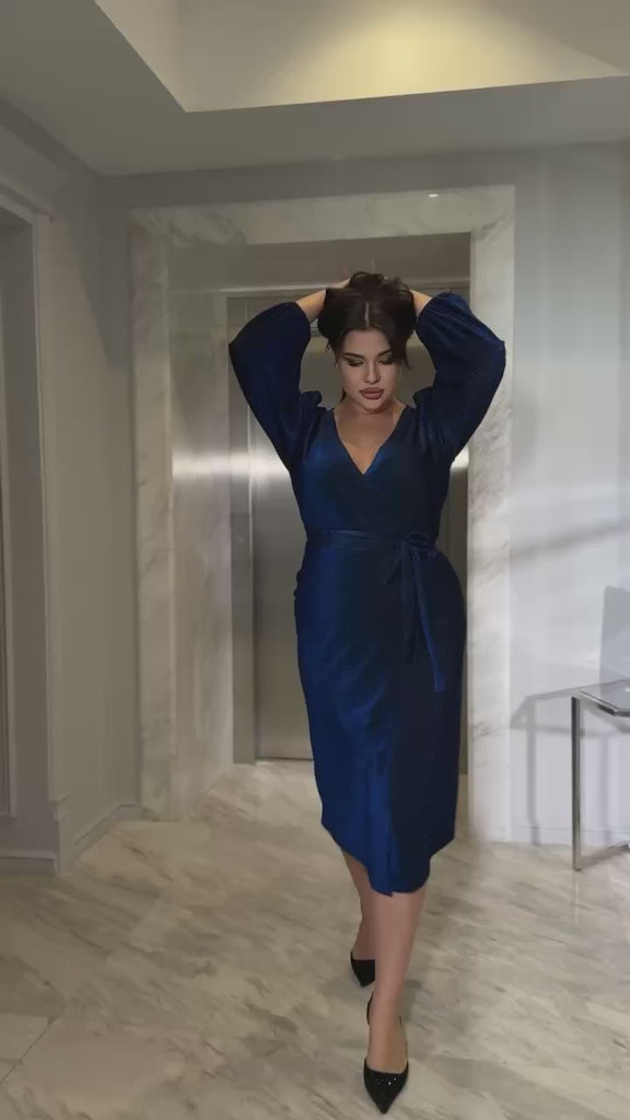 Вечерна рокля от лурекс с впечатляващ дизайн, който подчертава женствеността и елегантността. Моделът е с ефектна кройка тип "прегърни ме", създаващ стилна V-образна линия на деколтето. Обемните ръкави придават модерно и изтънчено излъчване, а миди дължината прави роклята идеална за вечерни поводи. Тази рокля ще добави блясък и стил към вашия специален момент.