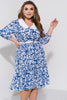 Тази чаровна миди рокля впечатлява с игривия си цветен принт и стилния контрастен яка, който е на мода за 2025 година.
