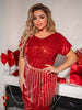Къса рокля от пайети с къс ръкав и обло деколте. Роклята е изцяло покрита с пайети, които създават ефектен блестящ вид, подходящ за вечерни събития и празнични поводи. Кройката е класическа, с къси ръкави и леко заоблено деколте, което придава женственост и изтънченост на цялостния вид.