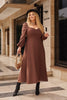 С отворено деколте тип „прегърни ме“ за женствен акцент и дълги ръкави с ластик за удобство. Разкроената кройка и миди дължината подчертават елегантния силует. Подходяща за различни събития.