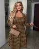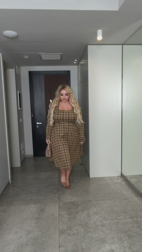 Рокля от трикотаж с кариран десен и квадратно деколте. Талията е с ластик отзад за перфектно прилягане и удобство при носене.