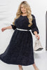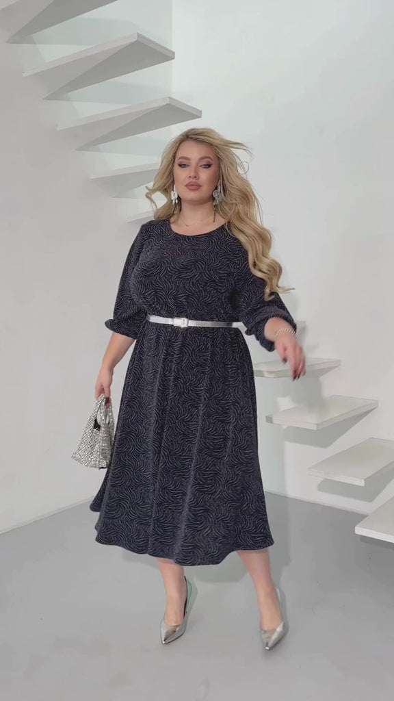 Миди рокля с блестящ ефект — изящен баланс между елегантност и ежедневен комфорт. Кръглото деколте, оформената талия и меки плисирани детайли създават женствен силует, а 3/4 ръкавите с лек обем на китките добавят чар. Коланът от комплекта подчертава талията, а деликатният блясък на материята придава празнично настроение дори в ежедневието.
