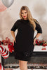 Стилна черна рокля с къси ръкави, украсени с бляскави пайети, които придават празничен и изискан вид. Роклята е с права кройка и е с пайети по горната част, ръкавите и долната част, създавайки елегантен и модерен ефект. Моделът е идеален за специални поводи и вечерни събития.