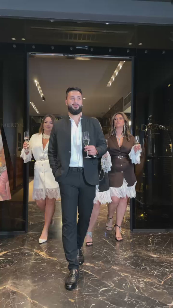 Разкошна рокля-жакет от креп-костюмна материя, декорирана с фин гипюр — един от водещите трендове този сезон. Моделът съчетава елегантност и леко игрив характер, което я прави идеален избор за специални и запомнящи се моменти.