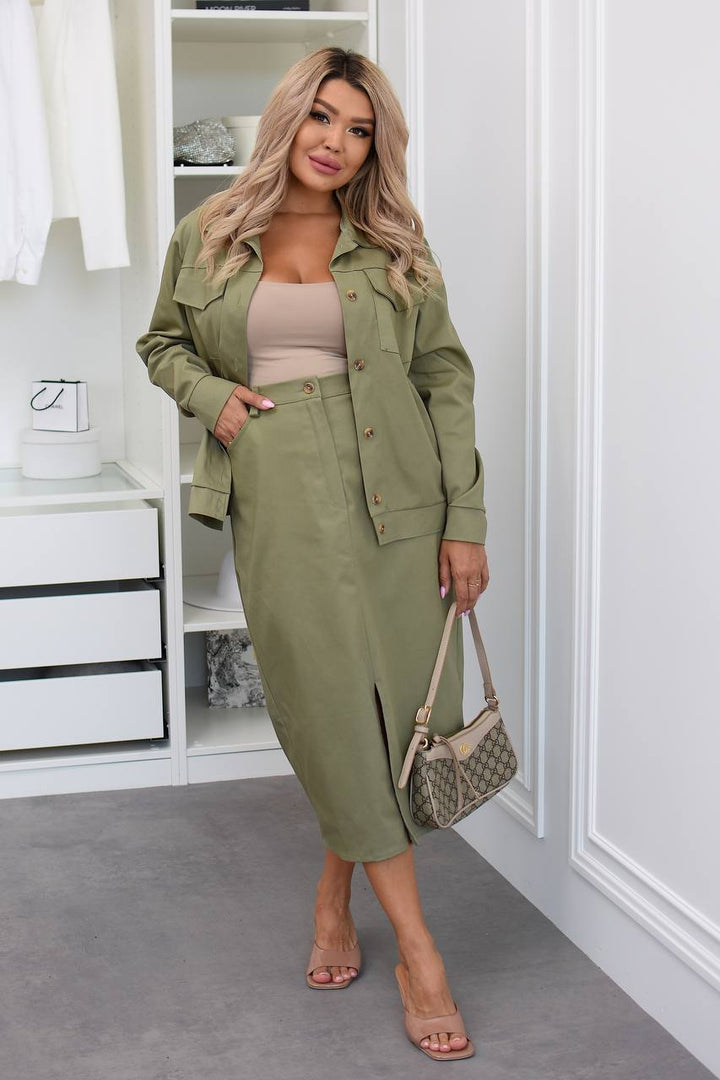 Стилен деним комплект – яке и пола с цепка. Модерен дизайн, който изразява индивидуалния ви