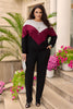 Дамски комплект с ефектен джемпер и удобен панталон. Джемперът е със свободен силует, кръгло деколте с двойна платка и спуснати ръкави с маншет. Долната част е оформена с платка. Стилен, комфортен сет за всеки ден.
