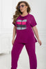 Всекидневен комплект с принт. Лек и удобен, този комплект е идеален за комфорт през целия ден. Тениската с подвижна декоративна връзка в полукръгло деколте и с къси ръкави придава изчистен и стилен вид. Ярката апликация добавя интересен акцент. Панталоните с прав силует и ластиик в талията предлагат удобство и свобода на движение, а страничните джобове са практично допълнение. На модела е показан размер 2XL-3XL.
