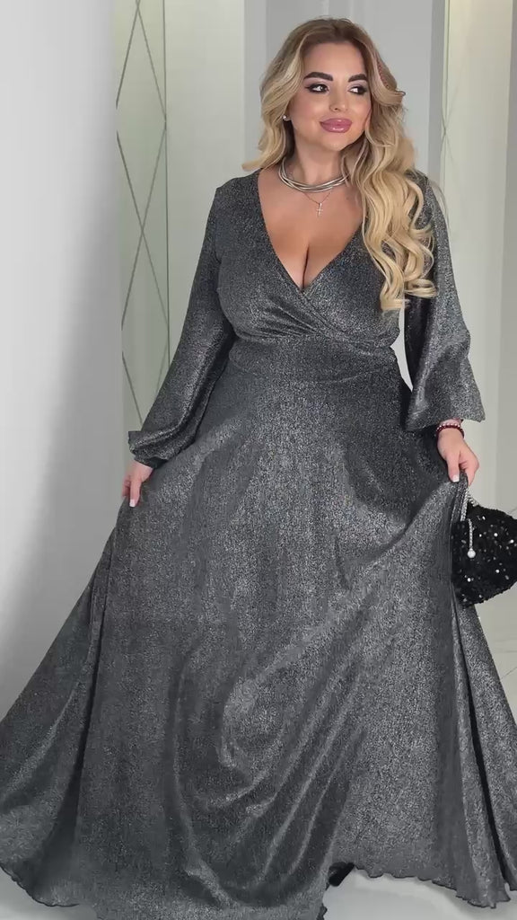 Дълга макси рокля с V-образно деколте и цип на гърба. Изработена от лурексова материя с добра еластичност – блестяща и удобна за специални поводи.