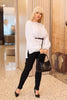 Стилен комплект, състоящ се от блуза с дълъг бухнал ръкав и ластик в маншетите. Предната част на блузата е леко скъсена, което създава модерна асиметрична линия. Панталонът е с класическа кройка и удобни джобове – подходящ за както ежедневна, така и по-елегантна визия.