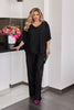 Комплект от структурирана материя, включващ блуза и панталон в свободна кройка, осигуряващ комфорт и елегантност. Панталонът има ластик в талията и странични джобове за практичност. Блузата е с V-образно деколте и цепки отстрани, добавяйки модерен и стилен акцент. Идеален избор за ежедневието или за по-елегантни поводи.