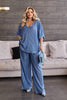 Комплект от структурирана материя, включващ блуза и панталон в свободна кройка, осигуряващ комфорт и елегантност. Панталонът има ластик в талията и странични джобове за практичност. Блузата е с V-образно деколте и цепки отстрани, добавяйки модерен и стилен акцент. Идеален избор за ежедневието или за по-елегантни поводи.