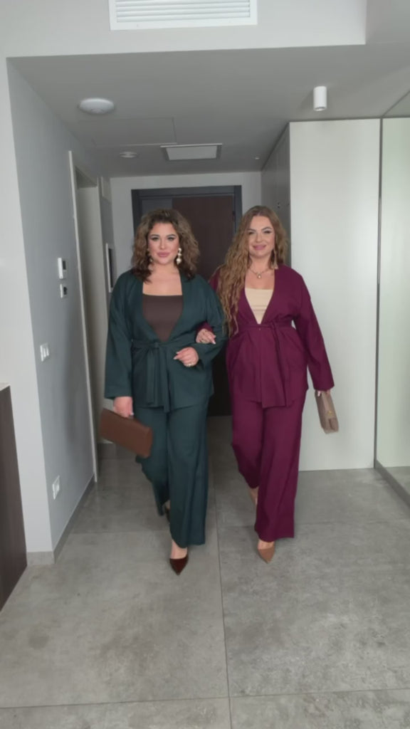Костюм от жилетка и панталон, изцяло от еластичен дънков плат. Жилетката е на запах и се завързва с колан, а панталонът има ластична талия за максимален комфорт.