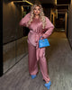 Луксозен дамски комплект от атлас – съвършено съчетание на елегантност, комфорт и модерен стил. Материята е копринено гладка с фин матов блясък, приятна на допир, пада красиво и подчертава движенията. Комплектът включва свободна блуза с дълги ръкави и прав панталон с колан на талията за оформяне на силуета, като издължава фигурата и подхожда на различни типове тяло. Универсален избор за празнични поводи, вечерни излизания и стилно ежедневие, който почти не се мачка и запазва безупречния си вид дълго време.