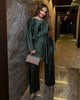 Луксозен дамски комплект от атлас – съвършено съчетание на елегантност, комфорт и модерен стил. Материята е копринено гладка с фин матов блясък, приятна на допир, пада красиво и подчертава движенията. Комплектът включва свободна блуза с дълги ръкави и прав панталон с колан на талията за оформяне на силуета, като издължава фигурата и подхожда на различни типове тяло. Универсален избор за празнични поводи, вечерни излизания и стилно ежедневие, който почти не се мачка и запазва безупречния си вид дълго време.