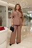 Комплект от блуза и широк панталон. Блузата е с прав силует. Панталоните са с права кройка и ластик в талията. Изработен от мека и удобна материя, подходящ както за ежедневие, така и за по-официални поводи.
