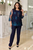 Костюм със свободен силует и 3/4 ръкави, декориран с бродерия върху тюл отпред и по ръкавите. Моделът е изработен за удобство и комфорт при носене.