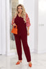Комплект с ръкави от шифон, състоящ се от блуза и панталон. Блузата е с прав силует и реглан ръкави от прозрачна тъкана с принт, който контрастира с основната материя. Ръкавите завършват с ластик, а деколтето е V-образно. В страничните шевове има малки цепки. Панталоните са със средна талия, джобове и леко вталена кройка.