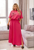 Стилен комплект от блуза и пола. Блузата е свободна с кройка „прилеп“ и 3/4 ръкави, с регулируема долна част на ластик. На предната част има апликация с надпис „It’s okay not to be perfect“. Полата е макси с два разреза отпред, функционални джобове и ластик на талията за сигурна фиксация. Изработен от дишащ и комфортна памучна материя. Свободната кройка осигурява удобство и подчертава стил, подходящ за различни поводи и лесно съчетание с обувки.