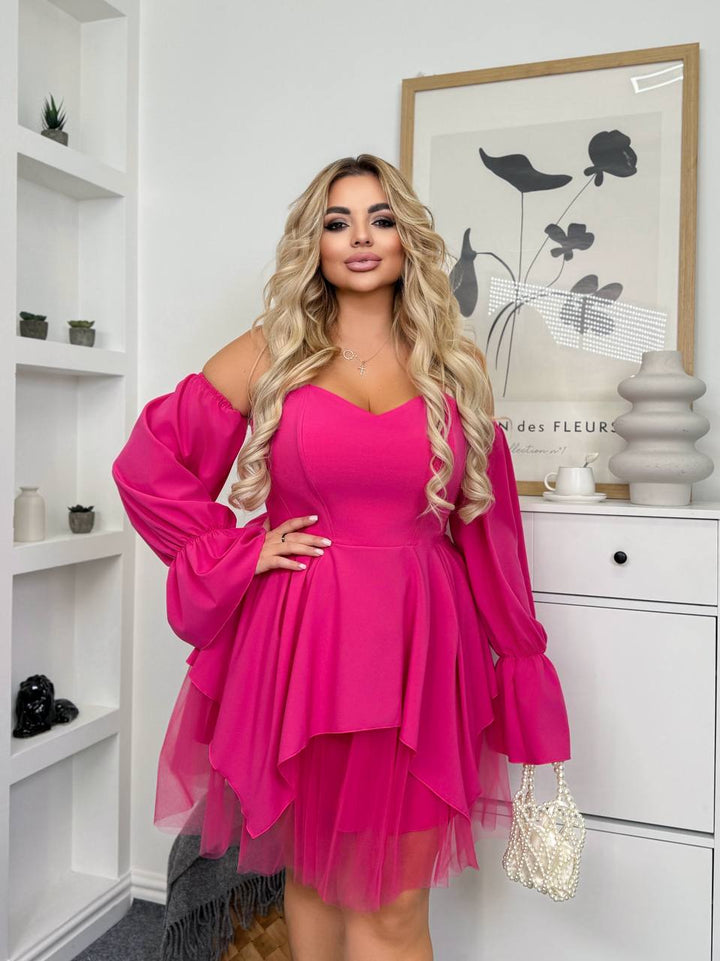 Рокля от две части – корсет и пола. Корсетът е подсилен с текстилен флизелин и оформен с шити кости по релефа, с меки ластици отзад за удобно прилягане и свобода на движение; може да се носи самостоятелно с клин, къси панталони или пола. Полата е от мрежа с подплата от софт, а ръкавите са сваляеми за още повече варианти на стилизиране.