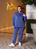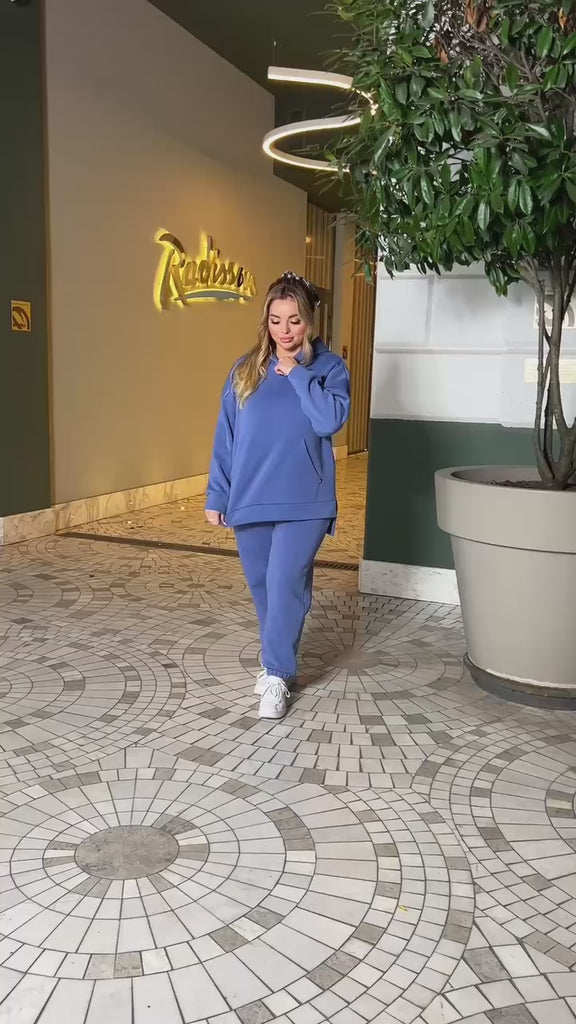 Топъл комплект от качествен трикотаж с флийс – удължено свободно худи с качулка и преден джоб, съчетана с панталон с ластик на долния край. Комфортен и практичен избор за всеки ден.