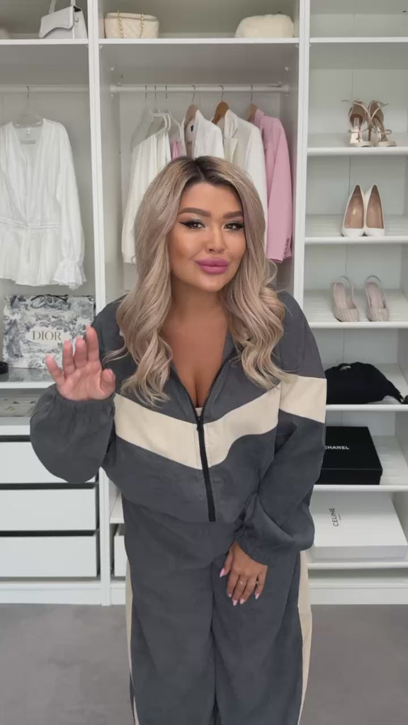 Трендов двоен комплект от мека велурена материя: яке с цип и широки панталони с джобове. Модерен дизайн и комфорт в едно.