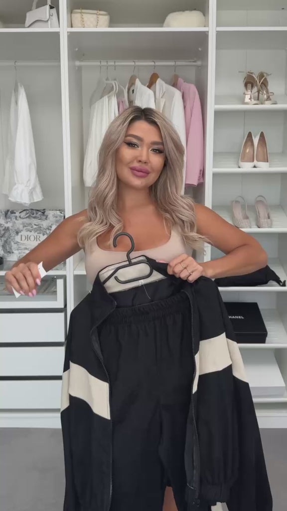 Трендов двоен комплект от мека велурена материя: яке с цип и широки панталони с джобове. Модерен дизайн и комфорт в едно.