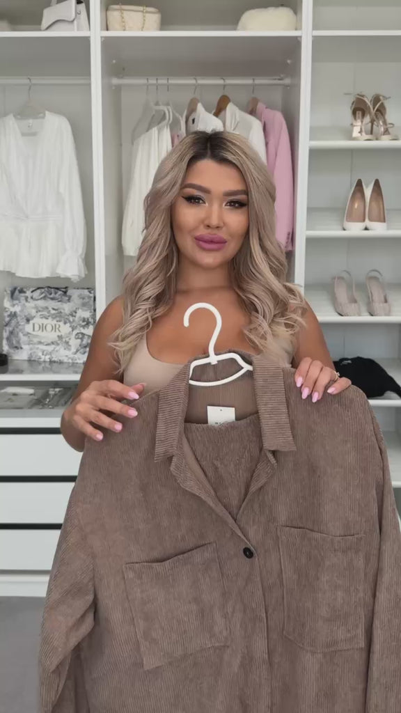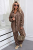 Трендов комплект оверсайз – свободна риза и панталони с висока талия. Панталоните имат джобове отпред и отзад за удобство и стил.