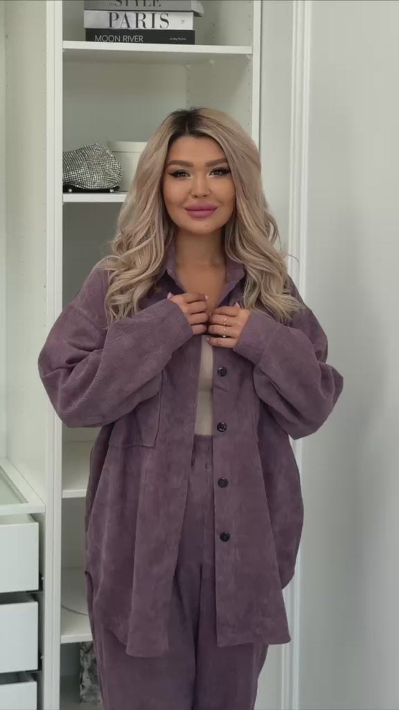 Трендов комплект оверсайз – свободна риза и панталони с висока талия. Панталоните имат джобове отпред и отзад за удобство и стил.