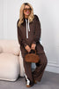Стилен дамски спортен комплект от кадифена материя със свободна кройка. Суичърът е с качулка, дълги ръкави и бели връзки за контрастен акцент, а панталоните са широки и прави, с бели лампаси и декоративни копчета отстрани. Моделът съчетава уют, модерна визия и женственост благодарение на меката тъкан и фините детайли.