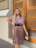 Моделът е с къс ръкав тип "кимоно", V-образно деколте и акцентирана талия с широк лъскав колан, който подчертава силуета.