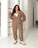 Модерен комплект от флийс с панталон и горнище, комбиниран с трикотажен топ. Моделът е с маншети, еластична талия и горнище с дълбоко триъгълно деколте, осигуряващо комфорт и стил за всеки ден.