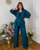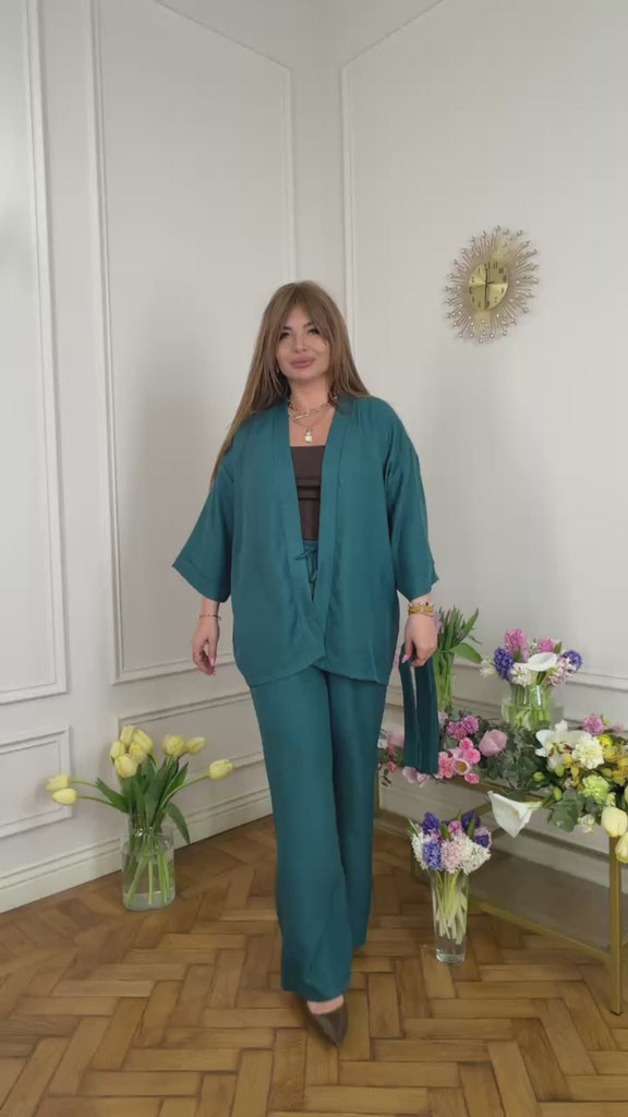 Стилен комплект за разходки от ленена смес — свободен кардиган с колан + панталони с висока талия, джобове в страничните шевове и връзка на кръста за регулиране. Лек и удобен модел за летни дни.