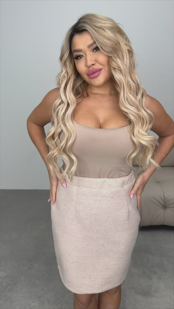 Комплект от жилетка без закопчаване с колан и къса пола, изработени от мек кашмирен трикотаж. Леката и топла материя осигурява комфорт, а елегантният дизайн прави комплекта подходящ както за ежедневни, така и за по-официални визии.
