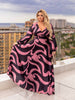 Дълга рокля от копринена материя с елегантен и красив десен, която придава изтънченост и стил. Роклята има скрит цип на гърба за елегантен завършек. Дължината на изделието е 150 см, а ръкавите с дължина 65 см добавят завършеност и комфорт. Перфектен избор за специални поводи или вечерни излизания.