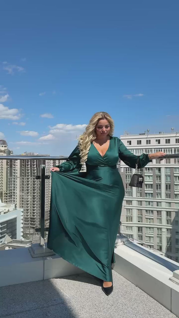 Дълга рокля с елегантен дизайн. Материята е лека и нежна, като придава на роклята изискан и луксозен вид. Роклята има V-образно деколте и дълги ръкави, които се стесняват на китката с маншети. На гърба има скрит цип за лесно обличане. Дължината на роклята е 150 см, а ръкавите са с дължина 65 см. Тази рокля е идеален избор за вечерни събития и официални поводи.