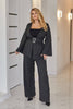 Стилен дамски костюм от плътен кашмирен трикотаж – идеалната комбинация от елегантност и комфорт. Правият панталон визуално удължава силуета, а сакото с колан подчертава талията и придава женственост. Перфектен избор както за офиса и делови срещи, така и за ежедневието.