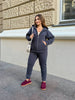Топъл дамски спортен костюм в oversize стил – идеален за студените дни. Худи с двойна качулка и цип, акцентирана със стилни декоративни шевове. Панталон с висока талия, удобен ластик и странични джобове за максимален комфорт.