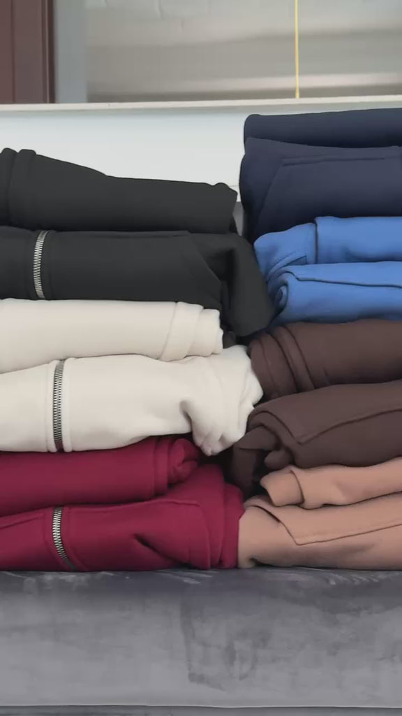 Топъл дамски спортен костюм в oversize стил – идеален за студените дни. Худи с двойна качулка и цип, акцентирана със стилни декоративни шевове. Панталон с висока талия, удобен ластик и странични джобове за максимален комфорт.